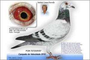 Soc. Columbófila Madalena Campeão Velocidade 2010 2º Mora I 251.847,5 Km 601 pombos 46º Messejana 363.527,2 Km 602 pombos 63º Algoz 440.849,5 Km 575 pombos 29º Mora II 251.847,5 Km 594 pombos 48º Mora III 251.847,5 Km 593 pombos 21º Aivados II 377.472,0 Km 565 pombos 13º Mora IV 251.847,5 Km 502 pombos 1º V. Novas I 273.311,2 Km 437 pombos