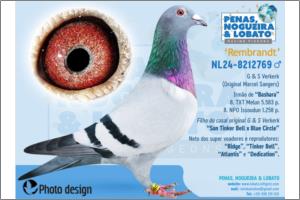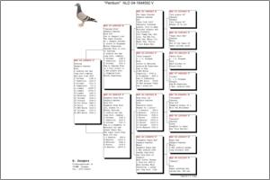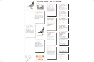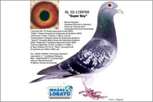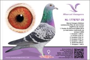 Marcel Sangers Irmão de “Tommy Gun” Campeão Provincial Velocidade; “Top Hen’051” 6º Pombo Nacional Fundo 2003; “Talita” Fêmea Campeã da Federação de Zutphen 2003; “Time Gun” 4º Nac. Orleans 7.784 p. e tio de “Flaming Red” Campeão Geral da Federação Zutphen; “André” Campeão Meio-Fundo da Federação Zutphen 2003; “Eagle Eye” Campeão Nacional Fundo 2000; “Fast as Lightning” 5º Nac. Le Mans 11.248p. e 8º Nac. Orleans 18.127 p.; “Nina” vencedora de 57 prémios em 2003 e 2004, etc. Pai – NL95-1400550 “The Super Breeder” reprodutor n.º 1 de Marcel Sangers Mãe – NL95-5536473 “T’kampiontje” neta do “Wonderboy’05” 2º Melhor Pombo da Holanda.