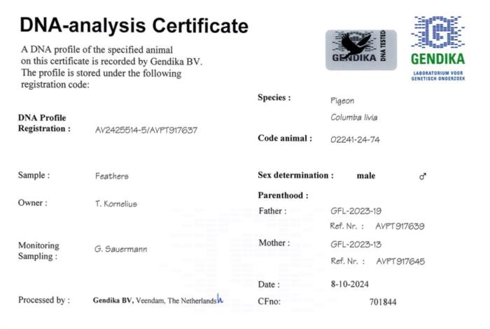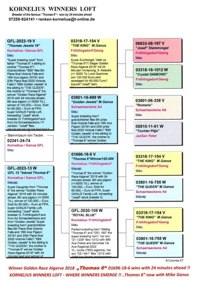 Original Thomas Kornelius, cruzamento de um meio irmão com uma filha do Thomas 6, vencedor do Golden Race '18 com 24 minutos de avanço (comprado por Mike Ganus onde se tornou um excelente reprodutor). Linha do famoso Romário de Hallmann (origens Ad Schaerlaeckens), um dos melhores reprodutores para Derbies, já 3 descendentes do Romário venceram o Golden Race ('18-'19-'24), além do Victoria Falls e outros grandes derbies. Também linha do Josef de Georg Fröhlingsdorf venceu 6X1º e 4X2º, os seus descendentes venceram mais de 28X1º e pombos Ás. Um dos melhores reprodutores da Alemanha. O Thomas 6 e vários irmãos são excelentes reprodutores, ele é avô de 1º e 2X2º Nacional contra 6 mil pombos, etc, uma irmã é avó do vencedor do Moledo 2023, outra é mãe do 1º Ás Regional entre mais de 7 mil pombos e do 1º Ás entre mais de 4 mil p., outro irmão é pai de: 1º 3.189 p. 1º 1.859 p., 2º 1.260 p. 3º 3.327 p. 7º 2.614 p., etc, etc Linha de pombos que tem vencido prestigiados prémios, tanto em grandes derbies como em provas de campeonatos, pombos Ás, etc, em vários países em vários continentes. É disto que procuro, pombos com variadíssimos parentes próximos a ganhar a nível Nacional e mundial em diversas linhas de parentesco. Este é muito semelhante aos seus ascendentes ganhadores. Um reforço para reproduzir para competir em campeonatos ou cruzar com outras linhas talhadas para derbies que também possuimos. Acompanhado por certificado de ADN.