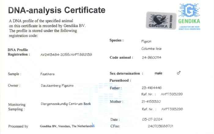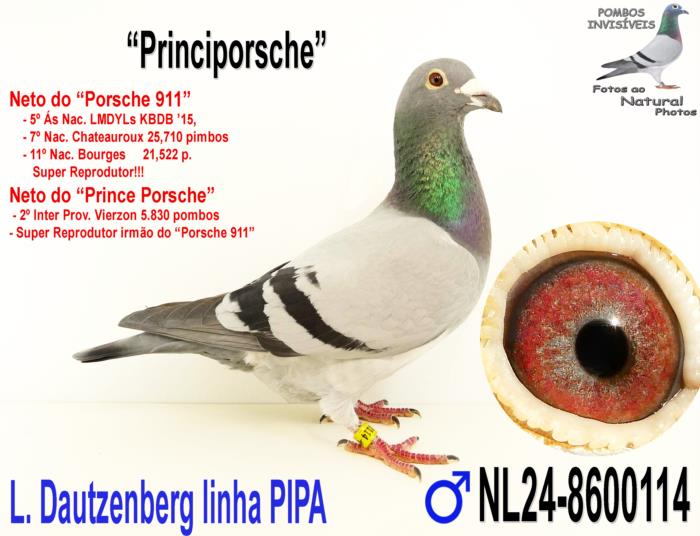 Vindo da Holanda mas filho de 2 originais PIPA, cruzamento de uma filha do Porsche 911 com um filho do Prince Porsche, dosi super reprodutores desta linhagem. É ainda neto da Sister Porsche e da Louise. Consanguíneo do casal de Ouro Wacko Freddy x Lieve. Uma Super Linhagem para MF e Fundo que se tem destacado com descendentes a vencerem a sério por todo o mundo. Porsche 911: 5º Ás Nac. Pigeon MF Longo YLs KBDB ’15 7º Nac. Chateauroux 25,710 p. 11º Nac. Bourges 21,522 p. 52º Nac. Montluçon 16,982 p. 38º Nac. Zona Argenton 5,327 p. Super Reprodutor desta linhagem!