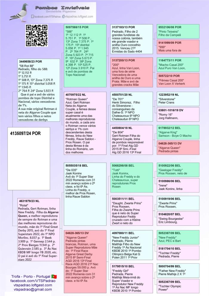 Vencedor do 2º Pombo Ás PC Arazede 2025, a escassos 10 pontos do 1º e mais de 70 de vantagem para o 3º. Foram 12 provas, com sol e chuva, neve e altas temperaturas, tempo limpo e fechado, vento a favor e contra. Verdadeiro teste de pombos. Sem desprezar o valor dos pombos do Rotman, há um pombo que vem aparecendo com frequência em pedigrees de pombos de grande destaque que é o "588", avô de muitos pombos de topo Distrital, que mais uma vez aparece aqui como avô de mais este 2º Ás. Este campeonato já ia desastroso a nível de perdas antes de iniciarem as provas e foi com o que restou que se fez o campeonato, à entrada da última prova tínhamos 3 pombos de 4 nos 10 melhores mas 2 não pontuaram na última e baixaram um pouco, mesmo assim 3 nos melhores 22 e há outra na dezena filha de uma original nossa. Um borrahco irmão legítimo deste pombo estará em leilão no GPloft a partir de Sábado.