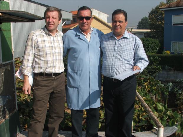 Em Estarreja visitámos o José Franscisco, columbófilo credor de particular estima pela sua dedicação à Columbofilia e à Sociedade Columbófila de Estarreja. Na foto Telmo Azevedo à esquerda e José Francisco Azevedo com o Baracho e o Fausto.