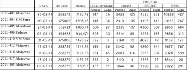 O "35" é, seguramente, um caso sério. Não sei se é o melhor do mundo, do país ou do distrito. Apenas sei que foi o melhor pombo do nosso pombal em 2011, e penso que não existem por aí muitos borrachos com resultados deste nível. A irmã mais velha, nascida na 1ª postura do casal, foi top ten no Derby da ACDA em 2010. Os restantes irmãos estiveram ao serviço da equipa Cometas, e brevemente serão objecto do devido destaque nesta página. Deixo os seus números, que permitirão averiguar da sua qualidade após consulta aos sites do G. C. Valmaior e da ACD Aveiro - (Distritais - Zona 4 - Sector 7 - Grupo N)