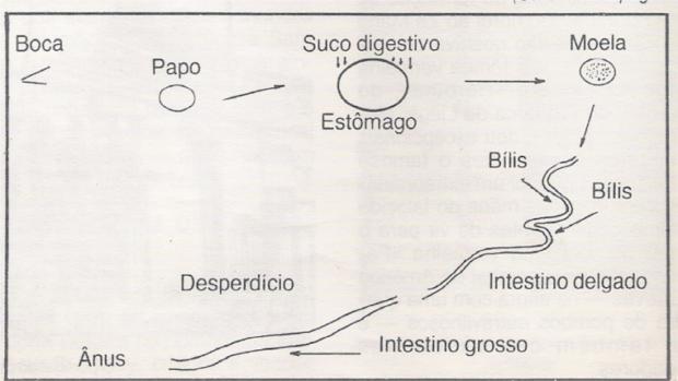O diagrama simplificado e mostrado ajuda a entender o complicado processo pelo qual o Pombo é capaz de usar o alimento que lhe é fornecido. O alimento é apanhado pelo Bico entre as Mandíbulas superior e inferior. Depois transportado através do Esófago para dentro do Papo. No Papo começa o processo da Digestão com o amaciamento dos Grãos que o Pombo comeu, e a sua passagem progressiva para o Estômago. No Estômago os líquidos vindos das Glândulas Estomacais são projectados sobre os Alimentos assim dando continuidade á sua transformação.