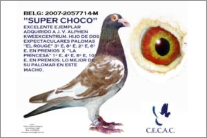 "EL SUPER CHOCO" Raça: MEULEMANS EXCELENTE EJEMPLAR ADQUIRIDO A J. V. ALPHEN KWEEKCENTRUM. HIJO DE DOS EXPECTACULARES PALOMAS "EL ROUGE" 3º E, 8º E, 2º E, 6º E, EN PREMIOS X "LA PRINCESA" 1º E, 4º E, 8º E, 10º E, EN PREMIOS. LO MEJOR DE SU PALOMAR EN ESTE MACHO.