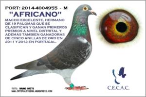 "AFRICANO" Raça: MEULEMANS/PUTTERIE MACHO EXCELENTE, HERMANO DE 19 PALOMAS QUE SE CLASIFICAN Y GANAN PRIMEROS PREMIOS A NIVEL DISTRITAL Y ADEMÁS TAMBIEN GANADORAS DE CINCO ANILLAS DE ORO EN 2011 Y 2012 EN PORTUGAL.