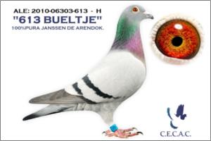 "613 BUELTJE" Una de mis mejores hembras JANSSEN. Excelente ojo, en manos y en apariencia, madre de imnumerables voladores excelentes en Alemania. Perfecta en todos los sentidos. Hija de dos Janssen directos seleccionados en el palomar de los Hermanos Janssen de Arendok. Líneas "ZOON DE BUEL" X "DOCHTER BLAUWE WINTERJONGE", "JONGE MERCKX" - "OUDE LICHTE".