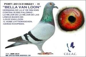"BELLA VAN LOON" Raça: VAN LOON ¡¡¡FISICAMENTE PERFECTA!!! HERMANA DE "598-11": 4º/582KMS/18.992 PALOMAS A COMPETIR EN EL DISTRITO DE PORTO. MEDIO HERMANA DE "NUMBER ONE": 1º/268KMS/5.563 PALOMAS, 1º/268KMS/3323 PALOMAS. LO MEJOR DE LO MEJOR DE LAS LÍNEAS BASES DE LOUIS VAN LOON, V. HOVE UYTTERHOEVEN, GERARD KOOPMAN, ETC.