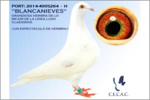 "NORA" Raça: Janssen/Gaby V. HIJA DIRECTA DEL HIJO DEL CRACK 50, HIJO DEL FAMOSO 50 DE EX PAULO FRANCO, ADQUIRIDO POR VICTOR PICANÇO, 1º PALOMA AS, CAMPEÓN NACIONAL Y PALOMA OLÍMPICA. HIJO DIRECTO DE LA ILSE, HERMANA DE PADRE Y DE MADRE DEL FAMOSO BLIKSEN DE GABY VANDENABEELE. LA MADRE ES HIJA DIRECTA DE LA FAMOSA PAREJA GABY PLUMA BLANCA X FRANCOISE, CONSIDERADA COMO LA MEJOR PAREJA DE GABY VANDENABEELE EN PORTUGAL.