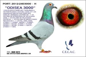"ODISEA 3000" Raça: Janssen/Gaby V. ¡¡¡EXCELENTE EJEMPLAR!!! ADQUIRIDA A VICTOR PICANÇO. HIJA DEL CASAL Nº1. UNA GRANDIOSA HEMBRA QUE DARÁ QUE HABLAR. HERMANA LEGÍTIMA DE: 1º AS PALOMA DE INTERZONAS DE VELOCIDAD 2009, 1º AS PALOMA DE VELOCIDAD DISTRITAL, 1º AS PALOMA DE MEDIO FONDO MACHOS 2011, 1º AS PAL. GRAL 2009, 274KM 1º/13346P., 380KM 1º/8.889P., 223KM 1º/6272P., 274KM 1º/6.030P. 223KM 1º/3678P., 274KM 1º/3207P., 274KM 1º/1865