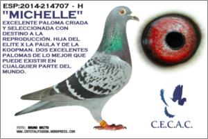 "LA MICHELLE" Raça: Janssen/Koopman EXCELENTE PALOMA CRIADA Y SELECCIONADA CON DESTINO A LA REPRODUCCIÓN. HIJA DEL ELITE X LA PAULA Y DE LA KOOPMAN. DOS EXCELENTES PALOMAS DE LO MEJOR QUE PUEDE EXISTIR EN CUALQUIER PARTE DEL MUNDO.