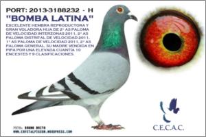 "BOMBA LATINA" Raça: GABY VANDENABEELE EXCELENTE HEMBRA REPRODUCTORA Y GRAN VOLADORA HIJA DE 2º AS PALOMA DE VELOCIDAD INTERZONAS 2011, 2º AS PALOMA DISTRITAL DE VELOCIDAD 2011, 1º AS PALOMA DE VELOCIDAD 2011, 2º AS PALOMA GENERAL. SU MADRE VENDIDA EN PIPA POR UNA ELEVADA CUANTÍA 10 ENCESTES Y 9 CLASIFICACIONES.
