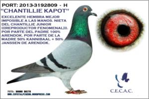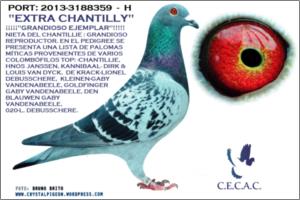 "EXTRA CHANTILLIE" ¡¡¡¡¡"GRANDIOSO EJEMPLAR"!!!!! NIETA DEL CHANTILLIE : GRANDIOSO REPRODUCTOR. EN EL PEDIGREE SE PRESENTA UNA LISTA DE PALOMAS MÍTICAS PROVENIENTES DE VARIOS COLOMBÓFILOS TOP: -CHANTILLIE, HNOS JANSSEN, KANNIBAAL- DIRK & LOUIS VAN DYCK, DE KRACK-LIONEL DEBUSSCHERE, KLEINEN-GABY VANDENABEELE, GOLDFINGER-GABY VANDENABEELE, DEN BLAUWEN-GABY VANDENABEELE, 020-LIONEL DEBUSSCHERE.