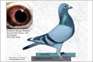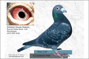 | Pai: 3123259/03 POR - "PINTO 2-59" | Mãe: 296/08 POR - "AZUL 296" | "PINTO 2-59" Raça: A.SOARES EXCELENTE REPRODUTOR FILHOS EXCELENTES VOADORES,ENTRE OUTROS A 6351953/06 CAMPEÃ DE VELOCIDADE 2009