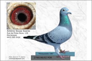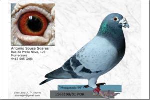 | Pai: 1568199/01 POR - "MOSQUEADO 99" | Mãe: 2110629/02 POR - "PINTA 629" | "MOSQUEADO 99" Raça: A.SOARES Macho MOSQUEADO Tipo: Reprodutor BOM VOADOR EM V.e M.F