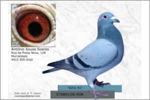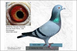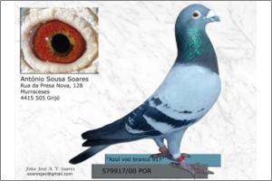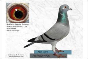 | Pai: 579917/00 POR - "AZUL VÕO BRANCO O 917" | Mãe: 7291000/07 POR - "AZUL 1000" | "AZUL VÕO BRANCO O 917" Raça: A.SOARES Macho AZUL VÕO BRANCO Tipo: Reprodutor ESTE POMBO COMO REPRODUTOR DISPENSA COMENTÁRIOS FILHOS E NETOS EXCELENTES VOADORES.