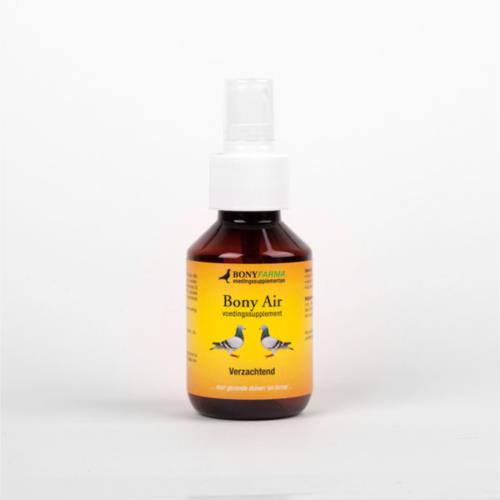 BONY AIR consiste numa mistura de vários óleos essenciais que têm um efeito anti-séptico sobre o ar do pombal. É também usado como apoio ao tratamento de infecções respiratórias. Contém ainda, na sua composição eucalipto, mentol, tomilho, cânfora e hortelã-pimenta. O conjunto de todos os ingredientes estimulam o funcionamento fisiológico da respiração.