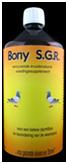 BONY S.G.R aumenta a capacidade de resistência. Tem propriedades acidificantes e ervas, Echinacea Purpurea, Eleutherococcus e Panax Ginseng. Além destas, contém outras ervas que ajudam numa melhor digestão e qualidade das fezes. Isso conduz ao equilíbrio da flora intestinal do pombo, impedindo o aparecimento da Candida anbicans e o crescimento de bactérias que causam doenças como a E. Coli. Os pombos que foram infectados com o adenovírus, recuperam melhor a sua condição física. BONY S.G.R pode ser administrado aos pombos ao longo de todo o ano.