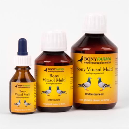 BONY VITASOL MULTI, é um concentrado líquido de vitaminas, que é facilmente absorvido no intestino. Este produto é uma alternativa ao Bony Farvisol, por isso estes produtos podem ser administrados de forma alternada.