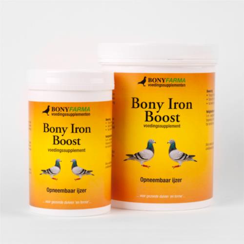 Bony Iron Boost é uma fórmula feita à base de ferro absorvível. Bony Iron Boost acelera a recuperação de pombos sujeitos a grandes esforços e apoia especialmente os borrachos. Após a administração de Bony Iron Boost os excrementos são de cor escura.