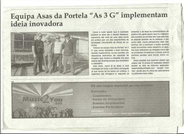 A "armada" foi constituída por 30 pombos da equipa mais 9 a treino e melhor não poderia ter sido. Um borracho, oferecido à nossa equipa pelo grande campeão Sebastião Martins, de Guimarães, ganhou o concurso, sendo que a restante equipa conseguiu marcações de relativa qualidade atendendo ao facto de todos serem pombos do ano.