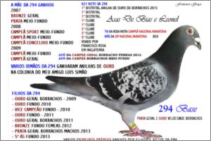 - OURO GERAL BORRACHOS - 2009 - VICE CAMPEÃO FUNDO - 2010 - OURO FUNDO - 2011 ------------------------------------------------------------------------ FILHO DA 294 PRATA GERAL BORRACHOS 2013 ------------------------------------------------------------------------ FILHA DA 294 19ª NACIOANL MARATONA 2013 -------------------------------------------------------------------------- FILHA DA 294 5º - PALOMA DE - 7178 - PALOMAS - VILLA FRANCA DE LOS BARROS 13º - PALOMA DE - 7489 - PALOMAS - MERIDA 71º - PALOMA DE - 7292 - PALOMAS - CACERES VOADO POR PEDRO VELAZQUEZ - ESPANHA - ------------------------------------------------------------------------ FILHO DA 294 CAMPEÃO GERAL BORRACHOS MACHOS 2011 VOADO POR JOÃO ALBERTO -------------------------------------------------------------------------- 5 FILHOS DA 294 COM PAIS DIFERENTES GANHARAM EM 2011 5 X1º DE VARIAS DISTANCIAS EM POMBAIS DE AMIGOS ACTUALMENTE ESTÃO A REPRODUZIR -------------------------------------------------------------------------- FILHO DA 294 X CHANTILIE 2004 1327199 /2011 1º - YERLINGS DISTRITAL ZONA CENTRO TORRES NOVAS ll 1º - GCF -------------------------------------------------------------------------- FILHO DA 294 X OURIVES 1313426/2011 6º - YERLINGS DISTRITAL ZONA CENTRO NISA ll -------------------------------------------------------------------------- FILHO DA 294 X OURIVES 1489879/2011 9º - YERLINGS DISTRITAL ZONA CENTRO TORRES NOVAS l ------------------------------------------------------------------------- FILHO DA 294 1593642/2011 1º - SARDOAL l 4º - NISA ll 7º - GUARDA l VOÁDO POR CARLOS GRADE ------------------------------------------------------------------------- FILHA DA 294 11ª ÁS ZONA CENTRO - FUNDO 2013 5ª ÁS GRUPO - FUNDO 2013 CLASSIFICOU 5º FUNDO 8º FUNDO NAS DUAS PROVAS MAIS DURAS DA ÉPOCA , QUE FECHARAM AS CLASSIFICAÇOES NO 2º DIA ------------------------------------------------------------------------- NETO 8580735/08 JOÃO IRENE CAMPEÃO GERAL BORRACHOS MONCARAPACHO ------------------------------------------------------------------------- NETO DA 294 CAMPEÃ BORRACHOS MEIO-FUNDO GRUPO - 2013 CAMPEÃ GERAL BORRACHOS FEMEAS 2º MELHOR EXEMPLAR BORRACHOS ZONA CENTRO 2º MELHOR EXEMPLAR BORRACHOS INTER/ZONAS ------------------------------------------------------------------------- NETO DA 294 - "621" - CAMPEÃO CLUBE - CAMPEÃO DISTRITAL YERLINGS - ANILHA DE OURO DE BORRACHOS 2013 - 2 X 1º DISTRITAL - 2 X 1º NO CLUBE - 2 X 3º - 5º CLUBE - VOADO POR FRANCISCO ROSA EM INGLATERRA ------------------------------------------------------------------------- NETO DA 294 ANILHA DE OURO GERAL BORRACHOS FEMEAS GRUPO 2013 ---------------------------------------------------------------- TAMBEM EM 2017 12 X 1º COM UMA FILHA E NETOS E MUITAS DEZENAS ------------------------------------------------------------------------- SOBRINHA DA 294 ROSA MOTA 8398494/2008 CAMPEÃ NACIONAL SPORT MARATONA 2014 CAMPEÃ DISTRITAL SPORT MARATONA 2014 13ª ÁS SPORT MARATONA EUROPEIA 2014 3ª ÁS GRUPO GRUPO 2013 ------------------------------------------------------------------------ SOBRINHO DA 294 OURO GERAL BORRACHOS 2007 ------------------------------------------------------------------------ SOBRINHO DA 294 4594790/04 Algumas Classificações: 1; 4, 5; 5; 6; 7;…. 2007 5º Melhor Pombo de Meio Fundo 6º Melhor Pombo da Geral 2009 5º Melhor Pombo de Meio FUNDO ------------------------------------------------------------------ SOBRINHO DA 294 6113811/06 2009 3º ÁS de Meio Fundo 6º ÁS da Geral SUPER REPRODUTOR ----------------------------------------------------------------- SOBRINHO DA 294 ****636/07 2010 4º ÁS Meio Fundo na S C Torres Vedras Actualmente é um ENORME REPRODUTOR ----------------------------------------------------------------- SOBRINHO DA 294 266757/10 2012 7º ÁS de Meio FUNDO 8º ÁS Geral 2013 3º ÁS Velocidade 5º ÁS Geral ------------------------------------------------------------------ SOBRINHO DA 294 9549496/09 Algumas classificações em 3 anos: 2; 3; 4; 4; 5; 5; 6; 8; 8; 12; 14;….. 2012 6º ÁS Velocidade 12º ÁS Meio Fundo 5º ÁS GERAL 2013 2º ÁS Meio Fundo no Campeonato Concelhio 6º ÁS Geral 2º Classificado Valladolid Prova Distrital - Dia da ASSOCIAÇÃO ------------------------------------------------------------------ SOBRINHO DA 294 1518878/11 2013 VICE CAMPEÃO ÁS Fundo na S. C. Torres Vedras GRUPO ------------------------------------------------------------------ SOBRINHO DA 294 ****637/07 2010 Campeã Meio Fundo na S. C. Torres Vedras GRUPO Campeã Meio Fundo Bloco 6 – Distrito de Lisboa ------------------------------------------------------------------ SOBRINHO DA 294 ...630/05 CAMPEÃO GERAL BORRACHOS GRUPO 3º ÁS MACHOS GERAL GRUPO ------------------------------------------------------------------ SOBRINHO DA 294 1518816/11 2013: 1º Classificado Valladolid Prova Distrital - Dia da ASSOCIAÇÃO