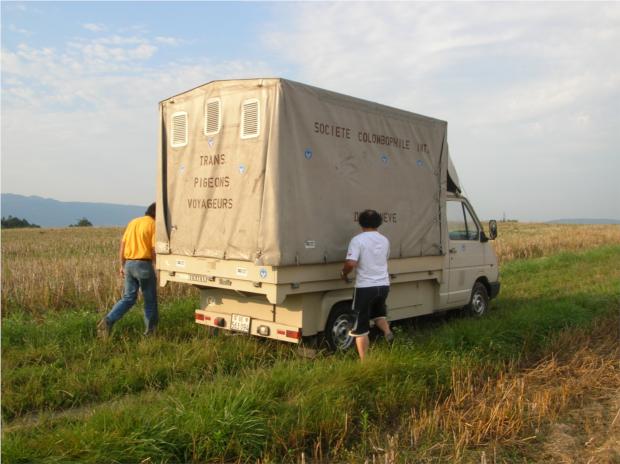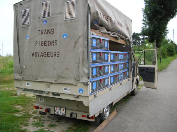 Derby D'Avusy 1° treino - BERNEX 10KM, de amarelo o Domingos Presidente da Sociedade Columbofila Internacional de Geneve e do Derby, de branco o Lucio na abertura da camioneta.
