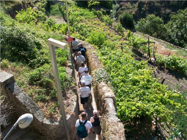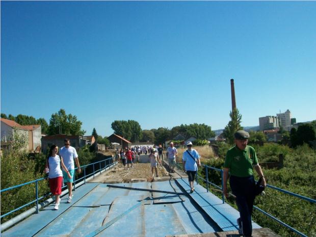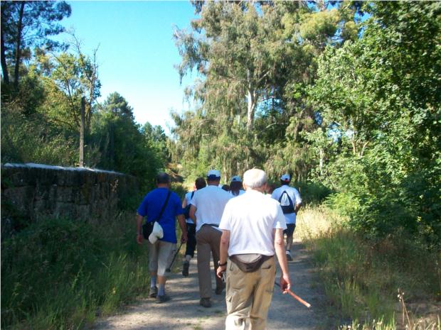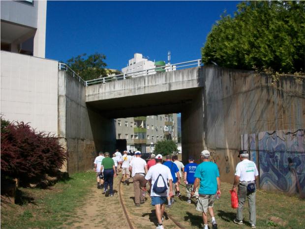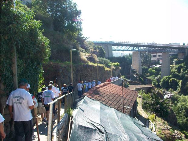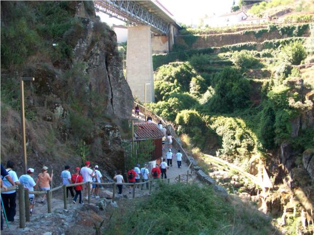 O GRUPO A ATRAVESSAR UMA PONTE NO ANTIGO CAMINHO DE FERRO