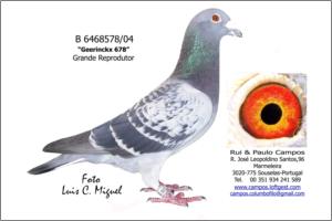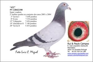 | "422" Raça: Rui & Paulo Campos Fêmea Azul Super voadora e reprodutora 2º melhor pombo do pom- bal no conjunto dos anos 2003 e 2004. Tavira I 2º/7.648 Évora 8º/7.354 Vidigueira 12º/7.656 Almodôvar 14º/7.140 Tavira II 28º/5.453 Tavira II 39º/6.734