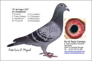 | "Fª do Super 224" Raça: Rui & Paulo Campos Fêmea Pedrada Grande voadora. Évora II 3º/13.411 V. Alentejo 5º/13.170 Almodôvar 6º/14.409 Elvas I 11º/6.410 Évora III 49º/10.920