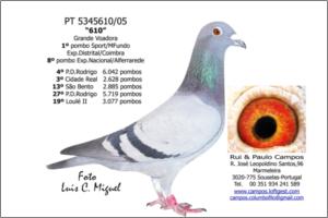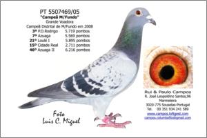 | Raça: Rui & Paulo Campos Fêmea Azul Anilha de Bronze Distrital MFundo e 1º Pombo Sport Meio Fundo Exposiçao Distrital em 2008. 8º pombo Sport Nacional de MFUndo na Exp. Nacional em Alferrarede P D Rodrigo 4º/6.042 pombos Cidade Real 3º/2.628 pombos São Bento 13º/2.885 pombos P D Rodrigo 27º/5.719 pombos Loulé II 19º/3.077 pombos
