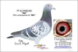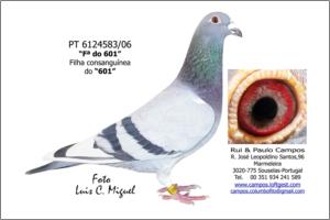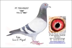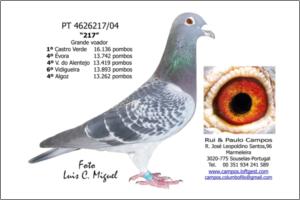 | Pai: 4626217/04 POR - "217" | Mãe: 7501418/07 POR - "Fª do 601" | "217" Raça: Rui & Paulo Campos Macho Pedrado Grande voador. Castro Verde 1º/6.136 pombos Évora II 4º/13.742 pombos Viana Alentejo 4º/13.419 pombos Vidigueira 6º/13.893 pombos Algoz 4º/3.262 pombos