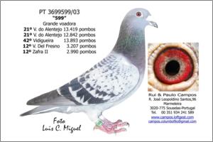 | "599" Raça: Rui & Paulo Campos Fêmea Pedrada Grande voadora. VAlentejo I 21º/13.419 pombos VAlentejo 21º/12.842 pombos Vidigueira 42º/13.893 pombos Vila Nueva Fresno 12º/3.207 pombos Zafra II 12º/2.990 pombos