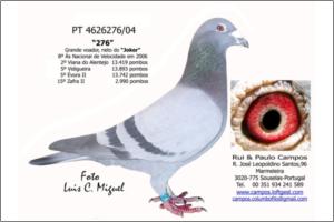 | "Fª do Joker" Raça: Rui & Paulo Campos Fêmea Pedrada Guias Branca Boa voadora Azuaga 3º/5.569 pombos P D Rodrigo 35º/5.719 pombos Loulé II 21º/3.077 pombos São Bento 45º/2.885 pombos Ermidas Sado 81º/5.088 pombos