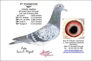 | "607" Raça: Rui & Paulo Campos Fêmea Pedrada Guias Branca 2º melhor pombo de MFundo da Zona Norte e 5º de todo o distrito em 2007. 2º pombo Sport MFundo na Exp. distrital em 2008 Loulé I 2º/5.895 pombos P D Rodrigo 15º/5.719 pombos Ermidas Sado 20º/5.088 pombos Loulé II 18º/3.077 pombos Azuaga II 42º/6.216 pombos