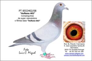 | Pai: 4626276/04 POR - "Fº do 489" | Mãe: 8553402/08 POR - "Hufkens 402" | "Fº do 489" Raça: Rui & Paulo Campos Macho Azul Grande voador. 8º Pombo As Nacional de Velocidade em 2006. V. Alentejo 2º/13.419 pombos Vidigueira 5º/13.893 pombos Évora II 5º/13.742 pombos Zafra II 15º/2.990 pombos Évora I 116º/13.339 pombos
