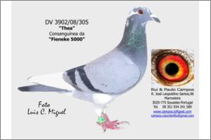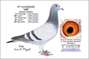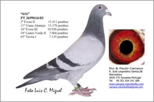 | Raça: Rui & Paulo Campos Fêmea Azul Boa voadora. Cidade Real 1º/2.711 pombos Castro Verde 18º/2.563 pombos Don Rodrigo 110º/6.042 pombos VN del Fresno 80º/3.207 pombos Castro Verde 86º/3.290 pombos