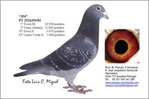 | Pai: 2526354/02 POR - "354" | Mãe: 5507361/05 POR - "Filha do Cego" | "354" Raça: Rui & Paulo Campos Macho Pedrado Escuro Grande voador.