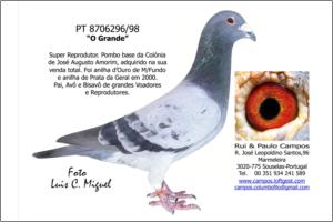 | Pai: 4626217/04 POR - "217" | Mãe: 6426148/06 POR - "Irmã do Grande" | "217" Raça: Rui & Paulo Campos Macho Pedrado Grande voador. Castro Verde 1º/6.136 pombos Évora II 4º/13.742 pombos Viana Alentejo 4º/13.419 pombos Vidigueira 6º/13.893 pombos Algoz 4º/3.262 pombos