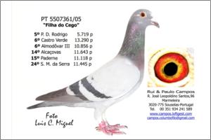 | "Filha do Cego" Raça: Rui & Paulo Campos Fêmea Azul Guia Branca Grande voadora. Almodôvar 6º/10.856 pombos Don Rodrigo 5º/5.719 pombos Alcaçovas 14º/11.643 pombos Paderne 15º/11.118 pombos Castro Verde 6º/3.290 pombos
