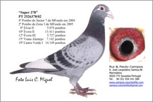 | Pai: 2526378/02 POR - "Super 378" | Mãe: 5507368/05 POR - "368" | "Super 378" Raça: Rui & Paulo Campos Macho Pedrado Guias Branca 4º melhor pombo