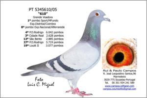 | Raça: Rui & Paulo Campos Fêmea Pedrada Irmã de ninho do "531", Anilha de Prata Geral e Velocidade e 4º Pombo de Velocidade da Zona 3 em 2009.