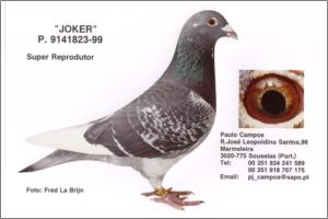 | Pai: 9141823/99 POR - "Joker" | Mãe: 4444/09 POR | "Joker" Raça: Rui & Paulo Campos Macho Pedrado Guias Branca Super Reprodutor Pai de vários 1ºs prémios e Anilhas de Ouro, Prata e Bronze em Veloc. e MFundo