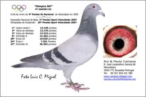 | "Olimpica 587" Raça: Rui & Paulo Campos Fêmea Azul 2º Pombo As Nacional de Velocidade na Exposiçao Nacional em Beja, foi seleccionada para as Olimpíadas de Oostende em 2007. Castro Verde 1º/14.149 pombos Portimão 6º/41.502 pombos Viana Alentejo 3º/13.419 pombos Viana Alentejo 3º/13.170 pombos Portimão 27º/36.942 pombos Irma de ninho do 4º Pombo As Nacional de Velocidade em 2005