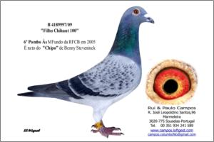 | "Neta Hufkens 663" Raça: Rui & Paulo Campos Fêmea Azul Pela parte do pai é neta da super reprodutora e fêmea base "Hufkens 663". Pela parte da mãe é neta do "Turbo" de Wal Zoontjens, que foi pombo Ás Provincial de Fundo em 1996.