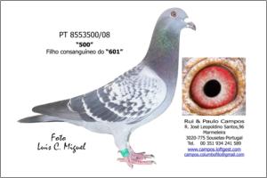 | Pai: 8553601/08 POR - "Filho do 601" | Mãe: 6123386/10 BEL - "Neta Dark Devil" | "Filho do 601" Raça: Rui & Paulo Campos Macho Pedrado Guias Branca Consanguíneo do pombo base e super reprodutor "Grondelaers 601"