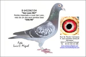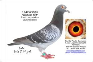 | Pai: 6445730/05 BEL - "Van Loon 730" | Mãe: 6483903/03 BEL - "Van Loon 903" | "Van Loon 730" Raça: Louis van Loon Macho Pedrado Guia Branca Importado a Louis van Loon. Pai do "531", Anilha de Prata Geral e Velocidade e 4º Pombo distrtal de velocidade (Zona 3) em 2009.