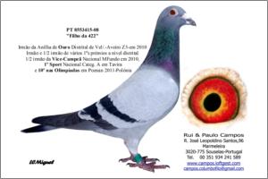 | Pai: 373300/10 POR - "Filho do 351" | Mãe: 8324817/08 POR - "Pedrada do Carlos" | "Filho do 351" Raça: Rui & Paulo Campos Macho Azul Guias Brancas Consanguíneo da super reprodutora e fêmea base "Hufkens 663". É 1/2 irmão da Anilha de Ouro distrital MFundo Z3, Geral e MFundo no GCMealhada em 2009 e vencedora do Dia da Associação contra 42.619 pombos, entre outros muito bons voadores. Uma irmã foi a mãe da Anilha de Ouro Distrital Velocidade em 2009, 2º Sport nacional Velocidade em 2010 na Exp. Nac. em Tavira e Pombo Olimpico em Poznan.