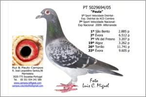 | "694" Raça: Rui & Paulo Rodrigue Fêmea Pedrada Grande voadora. 1º Pombo Sport Velocidade Exposiçao Distrital em 2008 e 7º Pombo Nacional Sport Velocidade na Exposiçao Nacional em Alferrarede 2009. Of. pelo Rui & Paulo Rodrigues. Évora 2º/6.512 pombos São Bento 1º 2.885 pombos Don Rodrigo 2º/5.719 pombos Don Rodrigo 5º/6.042 pombos VN del Fresno 7º/3.207 pombos