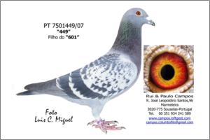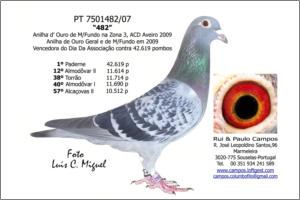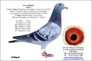 | Pai: 373234/10 POR - "234" | Mãe: 7501599/07 POR - "Fª do 601" | "234" Raça: Rui & Paulo Campos Côr: Pedrado Pela parte do pai é irmão da Anilha de Ouro Distrital de Velocidade em 2010 e pela parte da mãe é irmão da Anilha de Ouro Distrital de MFundo em 2009, assim como 1/2 irmão de vários pombos c/1ºs distritais.